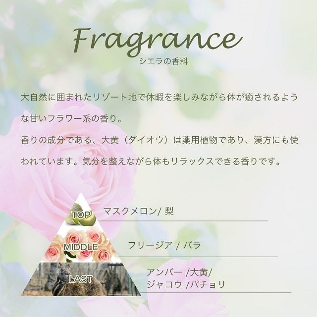 香り成分である大黄(ダイオウ)は薬用植物であり、漢方でも使用されており、癒しとリフレッシュ、内面からの美しさを手助けしてくれるフレグランスです。