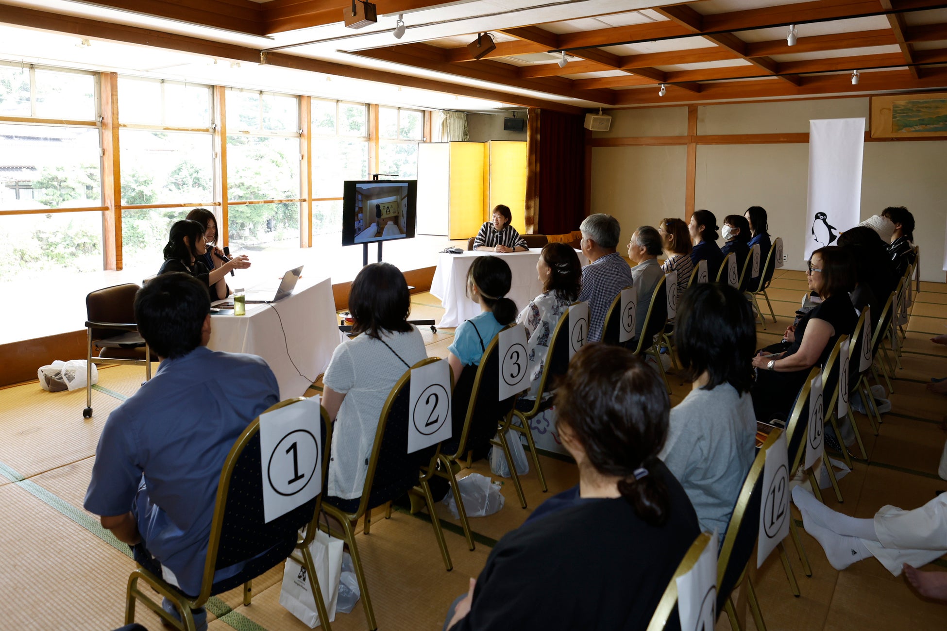トークイベントでは、さかざきちはるさんが「ペンギンルーム 嬉野」の誕生に込めた想いを、アート・本・設計の視点から登壇者とともに語りました。前日に描き上げた壁画制作時に、思わぬ“神さまへのお願い”があったというエピソードをはじめ、空間設計を手がけたOpenAさんによるリノベーションのこだわりなど、“ペンギンと暮らすように泊まる”というコンセプトに込められた工夫が語られるたびに、客席からは温かい拍手が湧き起こりました。