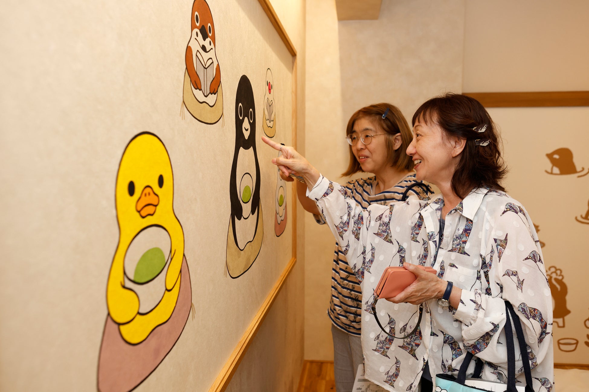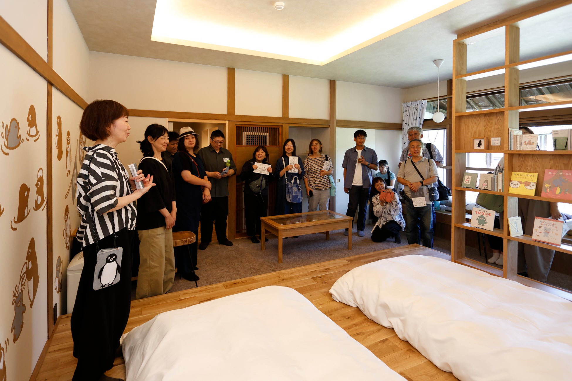 和多屋別荘スタッフのアテンドで館内の見どころをめぐりながら、いよいよ目的地の「ペンギンルーム嬉野」へ。お部屋では、さかざきさんご本人が壁画アートへの思い、ファブリックに隠された“小さなペンギンの物語”、飾られた原画の魅力を一つひとつ紹介してくれました。さらに、部屋に用意された“絶版本”のライブラリーにも注目が。参加者からは「ずっと眺めていたい空間」「まるで、さかざきさんの作品の中で眠っているみたい」といった声が寄せられ、ペンギンルーム嬉野への宿泊への期待が、いっそう高まった様子でした。