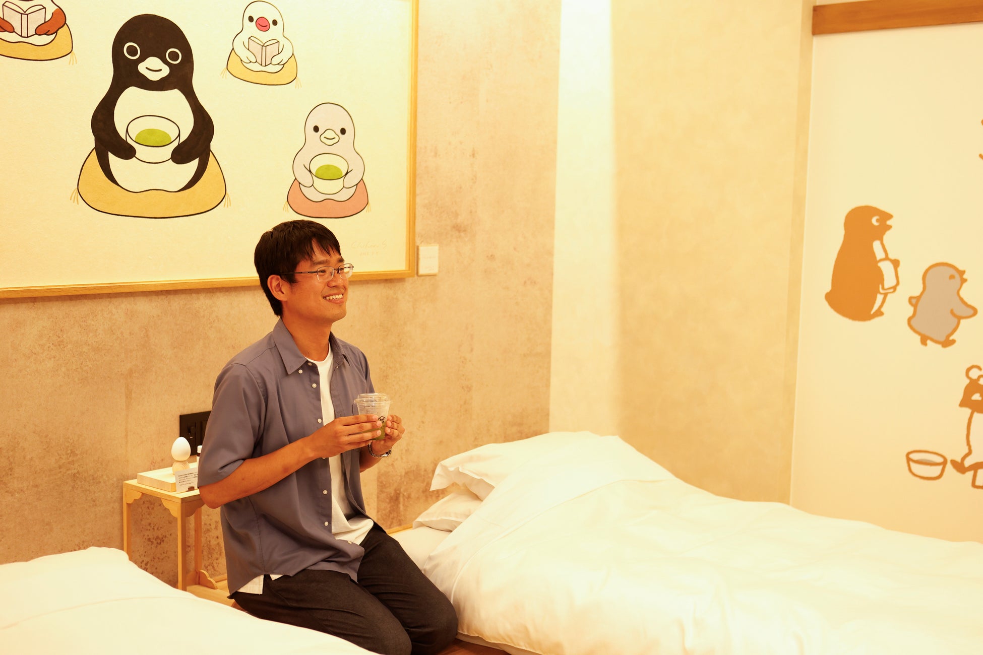 見どころは、佐賀の伝統工芸「名尾手すき和紙」に描かれた全長約2メートルの壁画アート。自然な和紙の質感に寄り添うように描かれたペンギンたちの姿に、訪れたファンからは「涙が出た」「やさしい色合いが心に残った」といった感動の声が多数寄せられました。本作品は宿泊者だけが間近で鑑賞できる、まさに“ここだけ”の特別展示です。