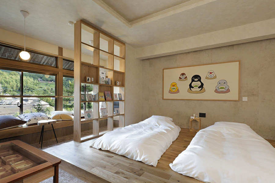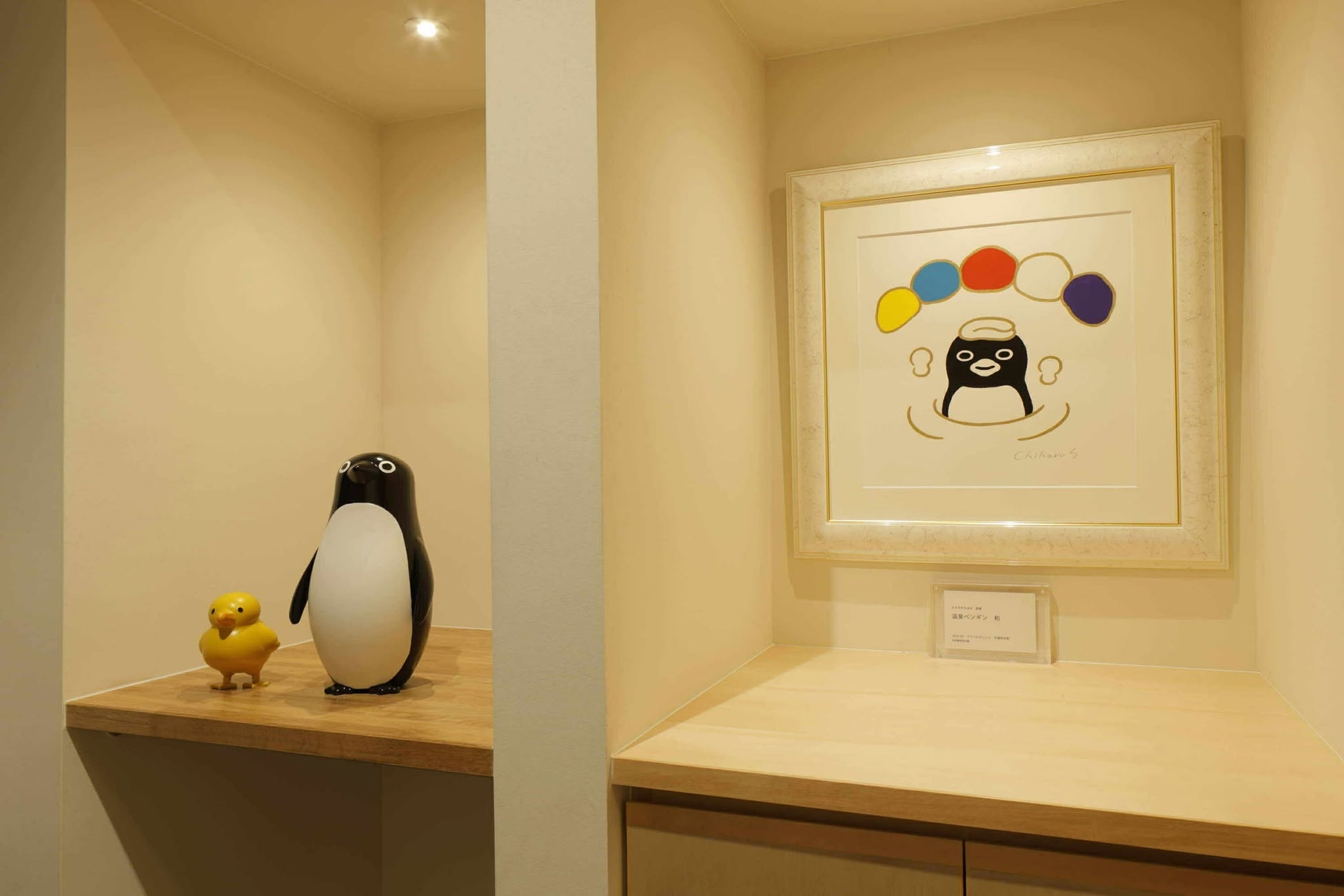 「ペンギンルーム 嬉野」は、大正ロマン漂う温泉郷フロアに誕生した、作品とともに“泊まれる”アート空間です。客室内には、さかざきさんの代表作『ペンギンアパートメント』をはじめとする原画や描き下ろし作品、和紙アート、絶版本を含む私設ライブラリーなどを設置。なかでも、名尾手すき和紙に描かれた全長2メートルの壁画アートは、さかざきさんにとって初の挑戦となる意欲作です。