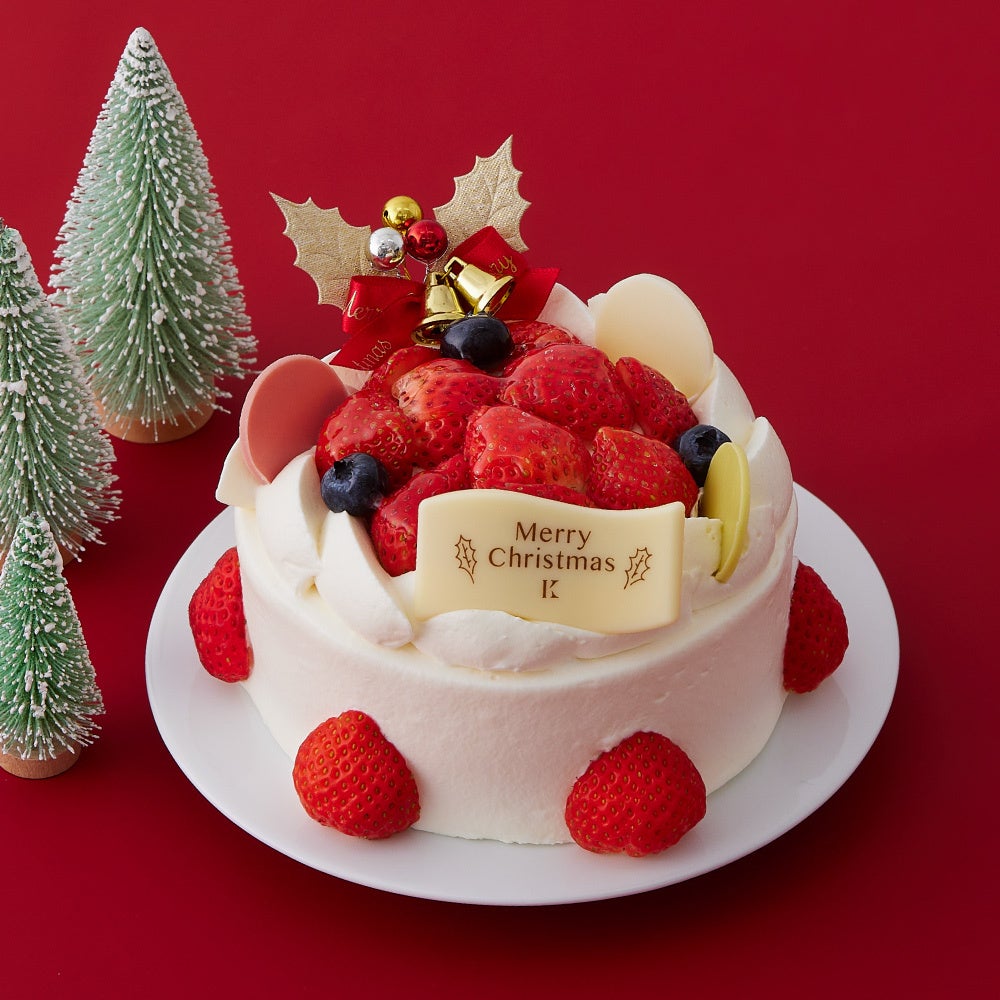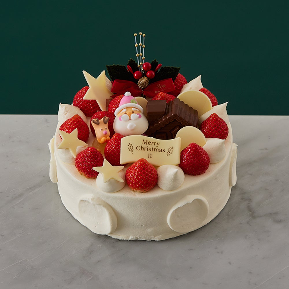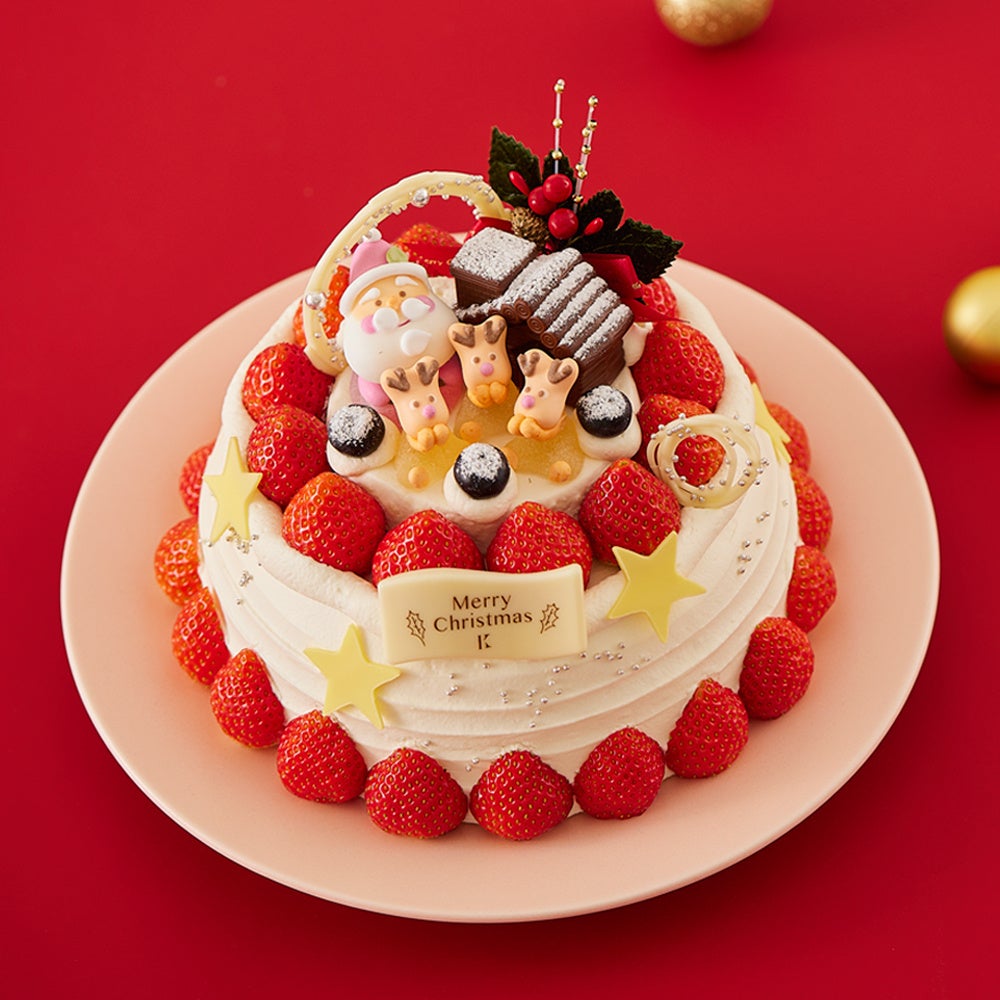 サンタやトナカイ、苺をずらりと並べた特別なケーキ。ふわふわのスポンジでフレッシュ名生クリームとスライス苺をサンドしました。真っ白な生クリームに真っ赤な苺、黄色い星が輝きます。子どもから大人まで、クリスマスのお祝いに笑顔が溢れる、華やかなデコレーションです。