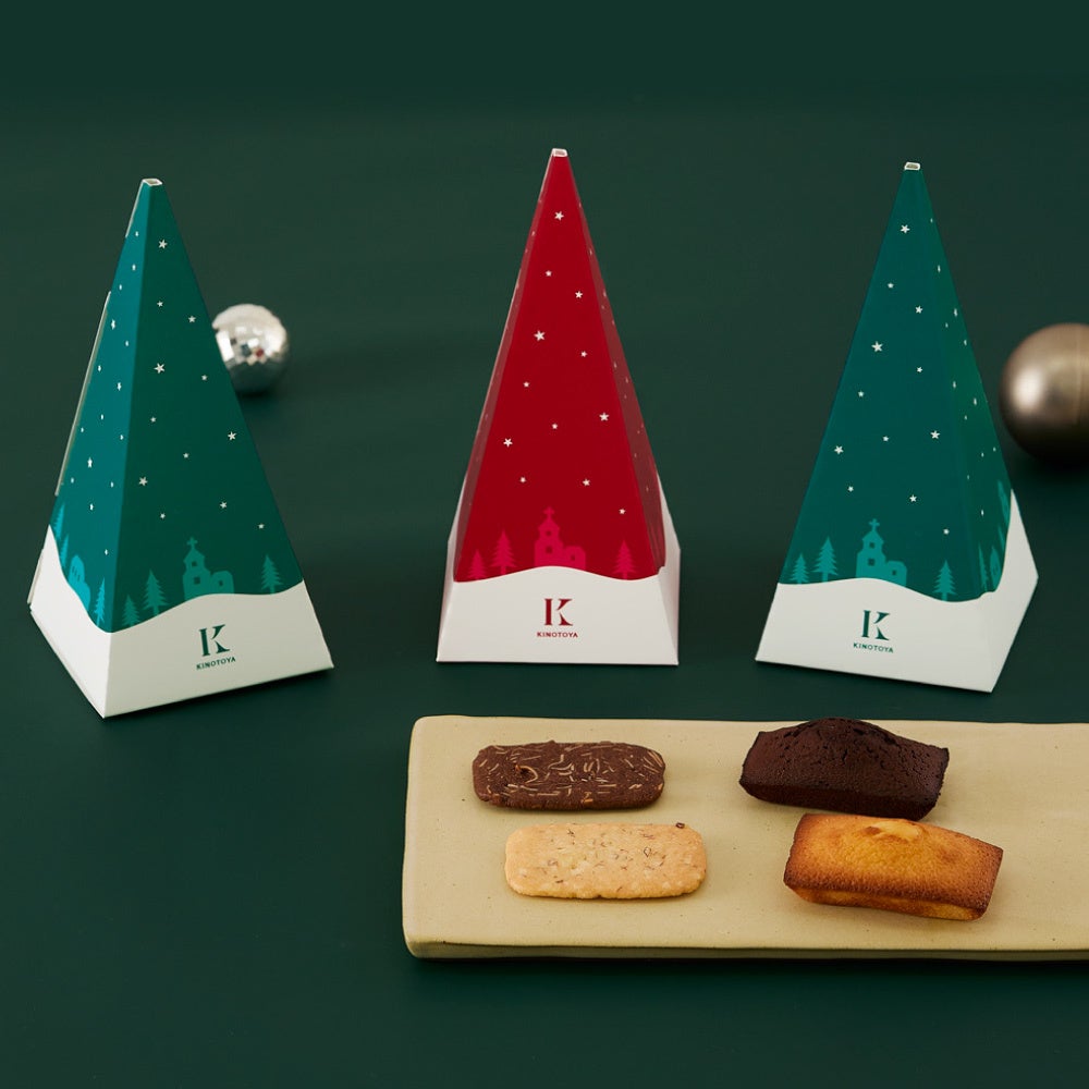 芳醇なバターとアーモンドが香るフィナンシェと薄焼きで軽い食感のきのとやクッキーを赤と緑のツリー型のBOXに入れました。