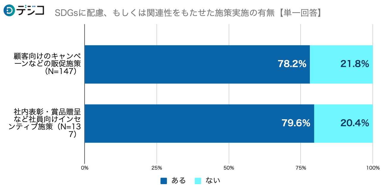 顧客向けのキャンペーンなどの販促施策や、社内表彰・商品贈呈など社員向けインセンティブ施策を実施した企業のうち、SDGs関連の施策を実施したかを聞いたところ、「顧客向けの施策を実施した」と回答した企業は78.2%にのぼり、「社員向けの施策を実施した」と回答した企業は79.6%にのぼりました。どちらも非常に割合が高く、販促施策や、インセンティブ施策において、SDGs関連施策は多く実施されている実態が見受けられます。