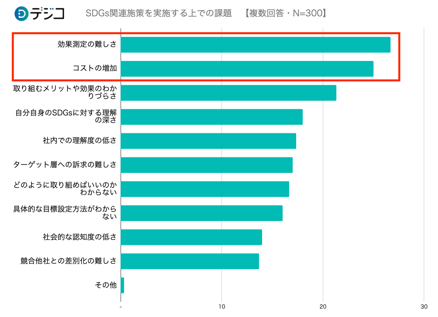 SDGs関連施策実施の課題1位は「効果測定の難しさ」、2位は「費用の増加」