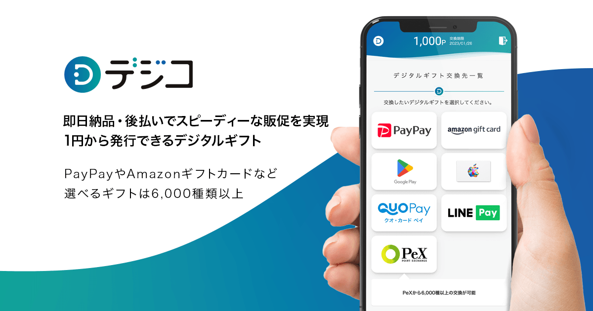 「デジコ」( https://digi-co.net/ )は、初期費用・月額費用無料で、PayPayやAmazonギフトカード、Apple Gift Card、Google Play ギフトコード、QUOカードPay、LINE Pay、PeXポイントギフトなどに交換可能なデジタルギフトを、1円単位1枚から当日発行することができるサービスです。いつでもすぐに必要な分だけ発行することができるため、企業の広告予算の調整や急なキャンペーンの実施などにも柔軟に対応することができ、当日まで人数把握が難しいイベントの謝礼などにも幅広く活用することが可能です。