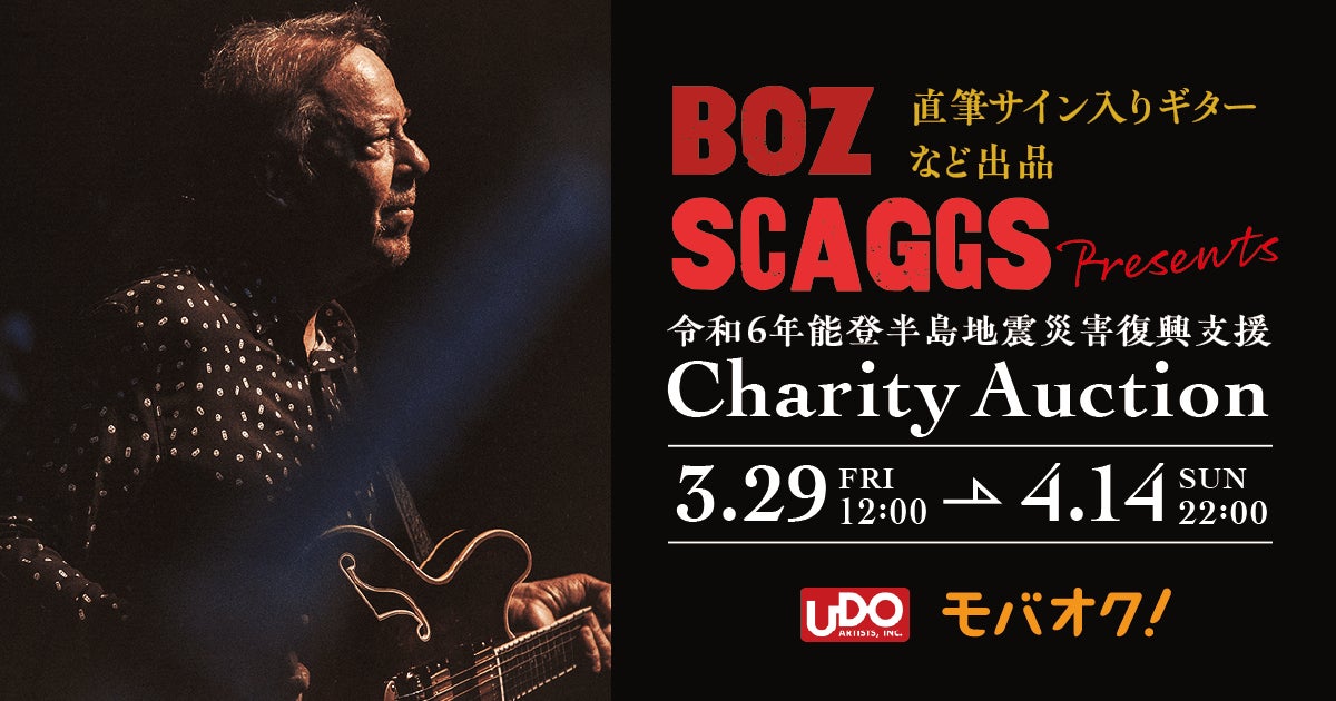 株式会社モバオク(本社:東京都渋谷区、代表取締役社長:生田目 知之、以下モバオク)が運営するオークションサービス「モバオク」にて、ボズ・スキャッグス氏が令和6年能登半島地震災害の復興支援として行う「ボズ・スキャッグスpresents 令和6年能登半島地震災害復興支援チャリティーオークション」を2024年3月29日(金)から開催します。