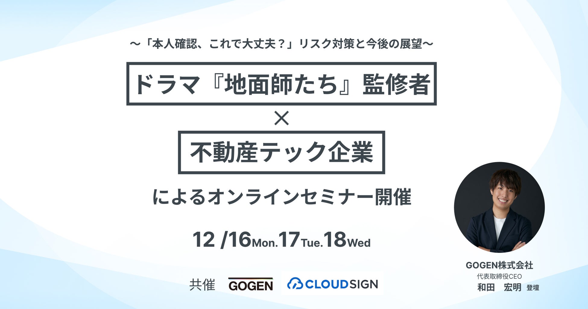 本セミナーでは、本作品の小説・ドラマの登記及び土地取引を監修した司法書士の長田修和氏、クラウドサインのトップセールスとして活躍後、現在はインサイドセールス部門責任者を務める小川和樹氏、そして日鉄興和不動産株式会社にて用地仕入れ・開発マネジメントの経験を持ち、現在は不動産DXを推進するGOGEN株式会社代表を務める和田の3名による、不動産詐欺へのリスク対策やITを活用した理想的な不動産取引契約・本人確認の在り方についてのトークセッションを行います。