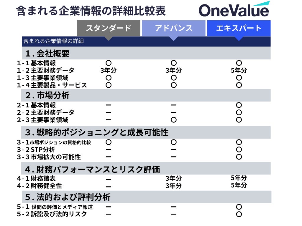 最も安価なプランですが、基本情報・主要な事業情報・具体的製品のデータといった、市場調査・企業分析に必要な情報が十分に含まれています。