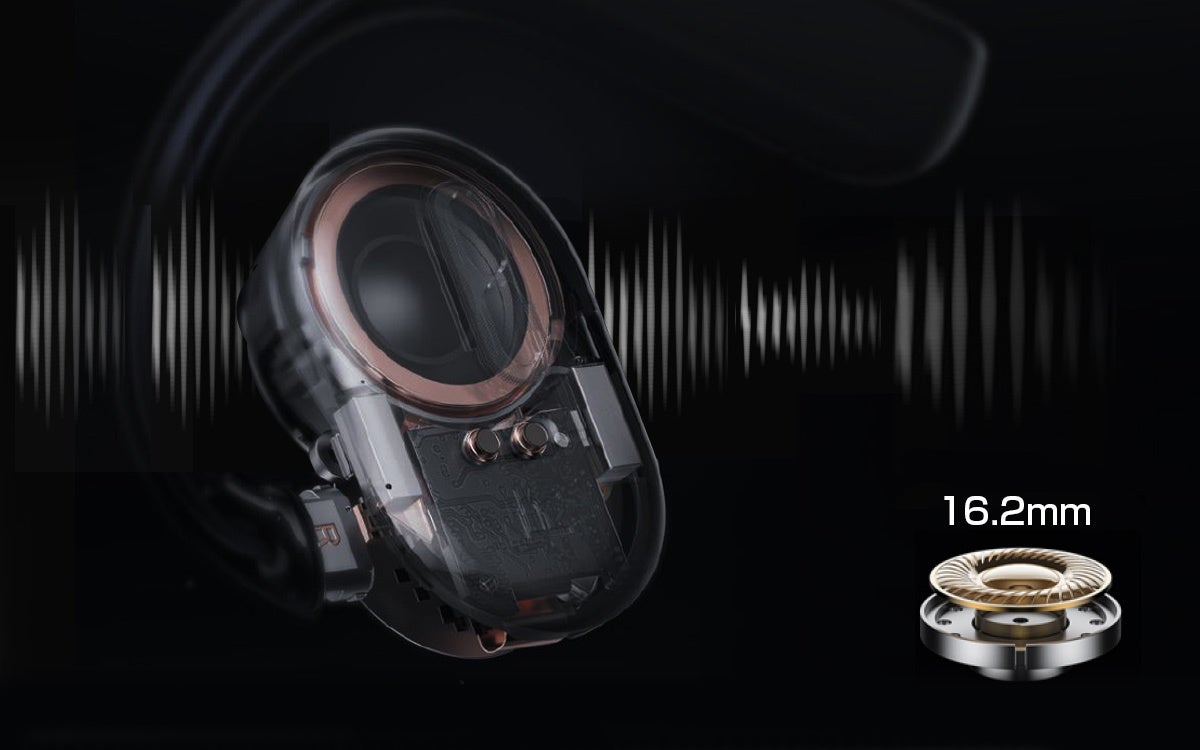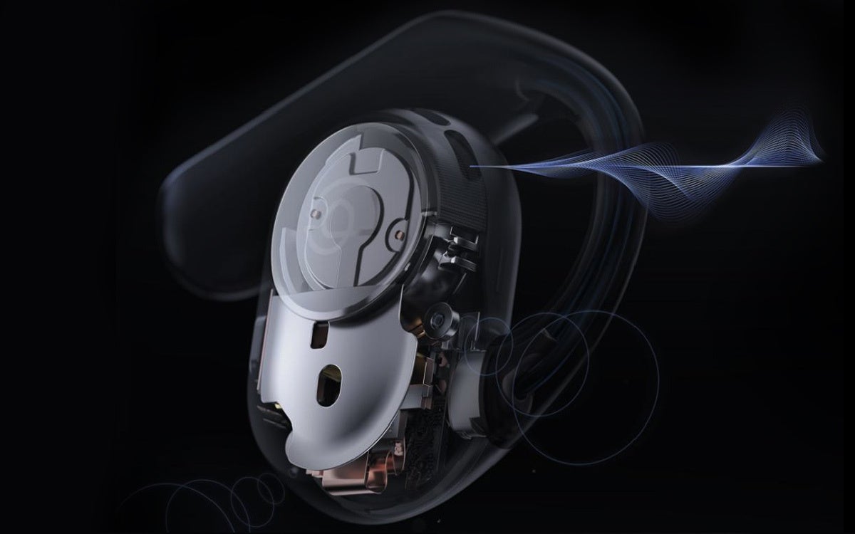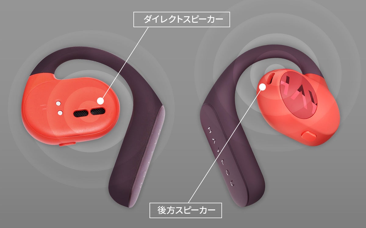 片耳4つのスピーカーホールを設け、外耳道に向けられたダイレクトスピーカーは、心揺さぶる迫力サウンドをダイレクトに鼓膜へ届ける役割を担い、後方スピーカーからは、音が耳輪を伝い空間的なサウンドを届けるほか、サウンドキャビティ(空間設計)で音質のクリアさや音漏れを最小限に抑える役割を担います。