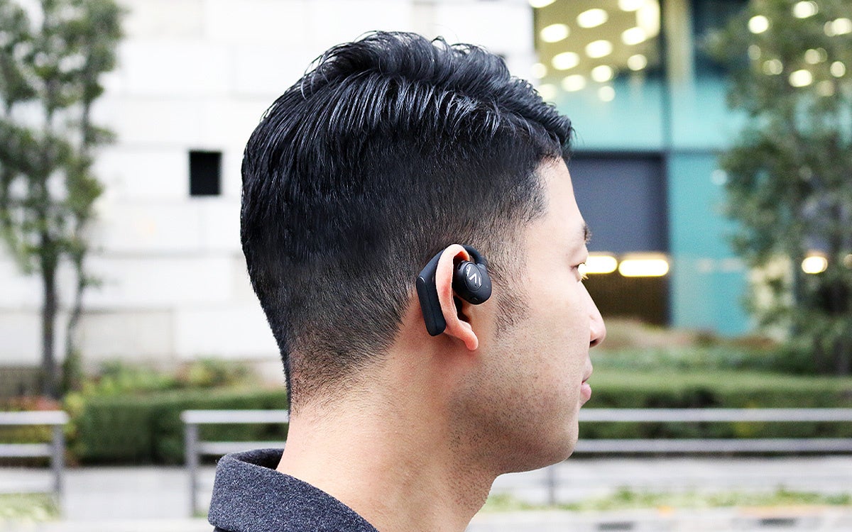 耳孔を圧迫しないため、長時間使用してもストレスを感じません。インイヤー型イヤホンに比べて聴覚へのダメージを軽減できるだけでなく、外耳を清潔に保ち、周囲の音が聞けることで安全性も確保できます。