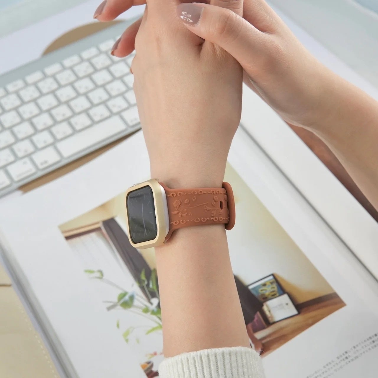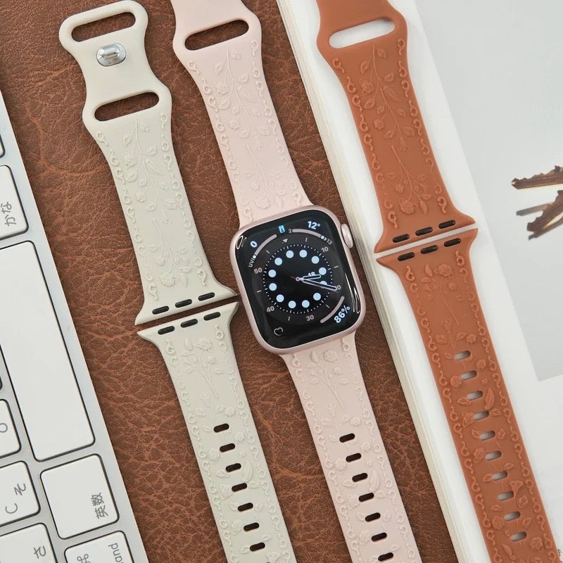 華やかな柄が浮かび上がった浮彫風のアップルウォッチバンドです。どこかレトロで繊細な魅力的な雰囲気をまといます。シリコン製なので防水かつお手入れも簡単で、日常づかいにもぴったりです。