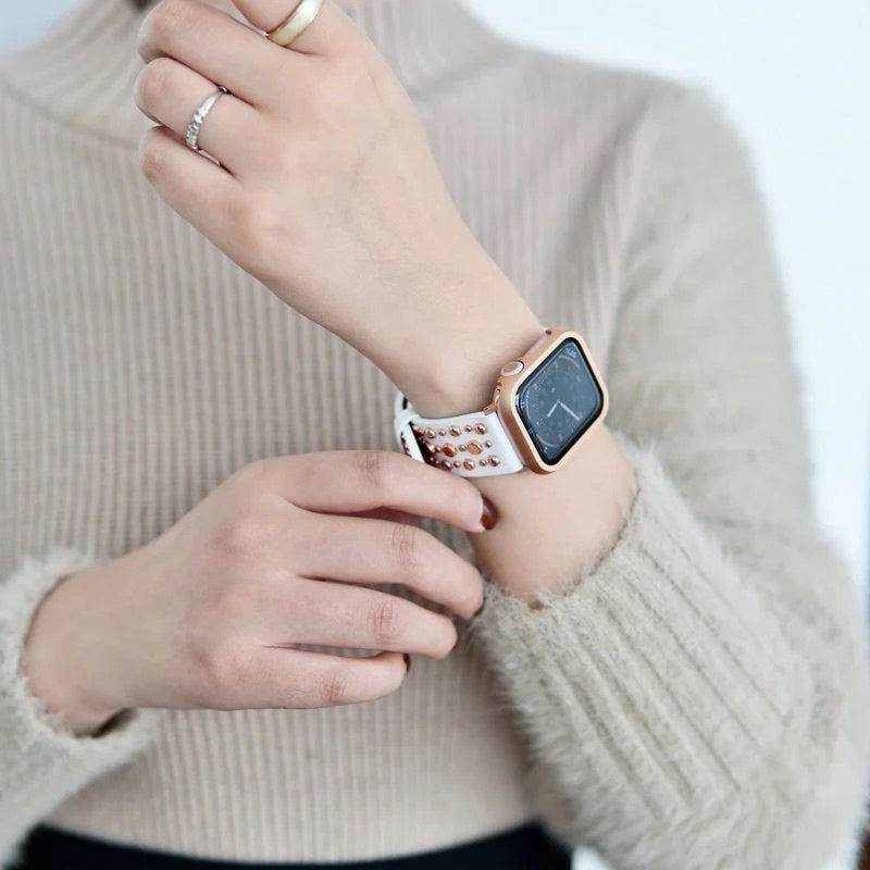 丸型のスタッズを散りばめた珍しいデザインのアップルウォッチバンドです。大きさの異なるスタッズは几帳面な並びの中にも遊びや動きを生み出します。