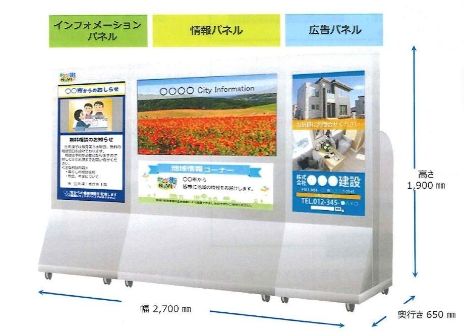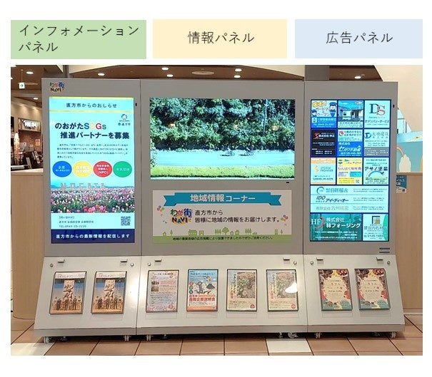 インフォメーションパネルは、市が定期的にイベントの情報を更新できるため、同モールへ来店された方に、直方市の魅力や日常生活に関わりの深い情報を、動画や静止画でタイムリーにお届けできるようになります。なお、「わが街NAVI」設置費用などは、広告収入で賄うため、直方市の財政負担はありません。