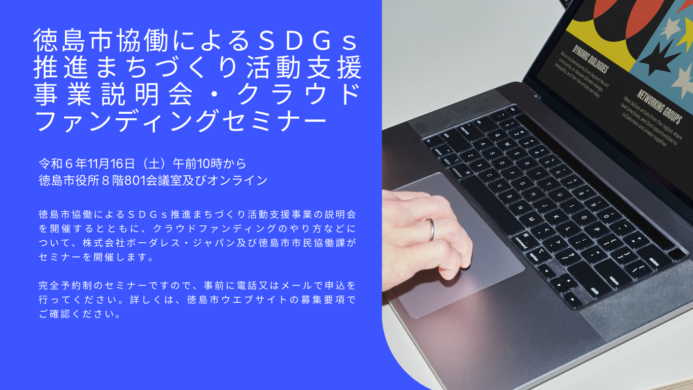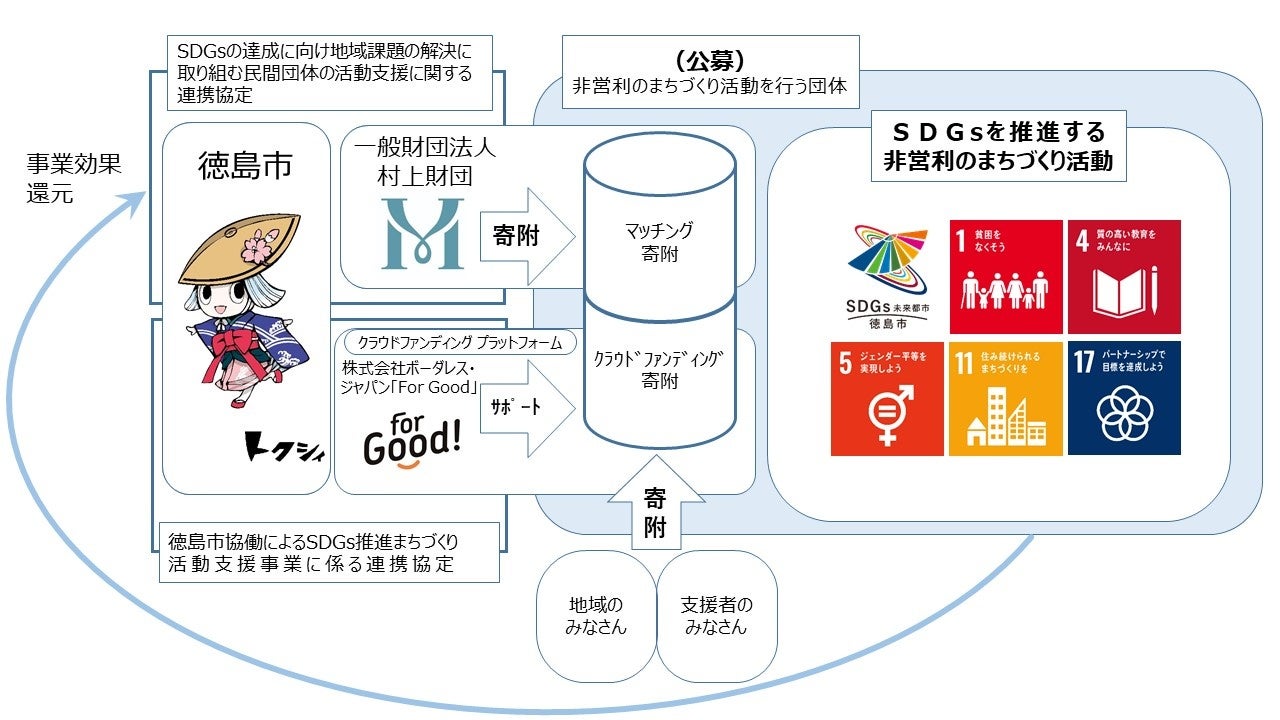 徳島市は、一般財団法人村上財団及び株式会社ボーダレス・ジャパンと連携し、SDGs推進まちづくり活動(持続可能な地域づくりに資する非営利の取組)を支援します。