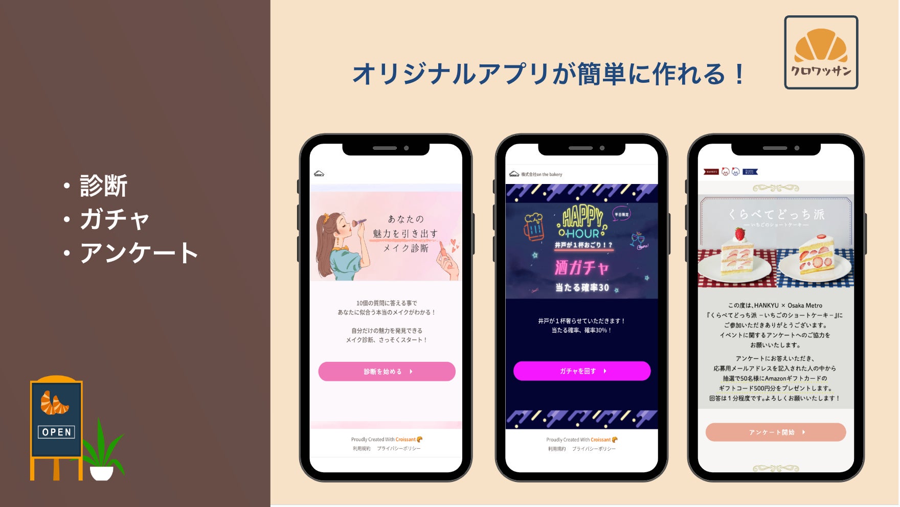 <診断・ガチャ・アンケートアプリ生成の「クロワッサン」公式URL> https://www.lp.croissant.buzz/