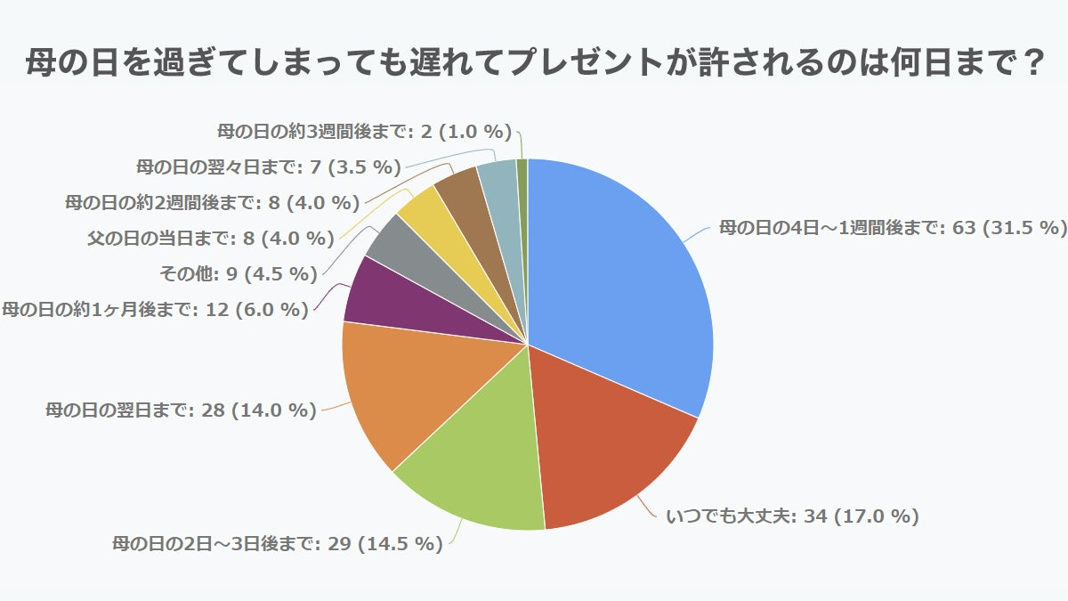 そこで、まず母の日.meでは全国のお母様200名にアンケート調査を実施。母の日にプレゼントを渡せなかった場合、その後何日ぐらいまでなら許容できるかを聞いてみました。