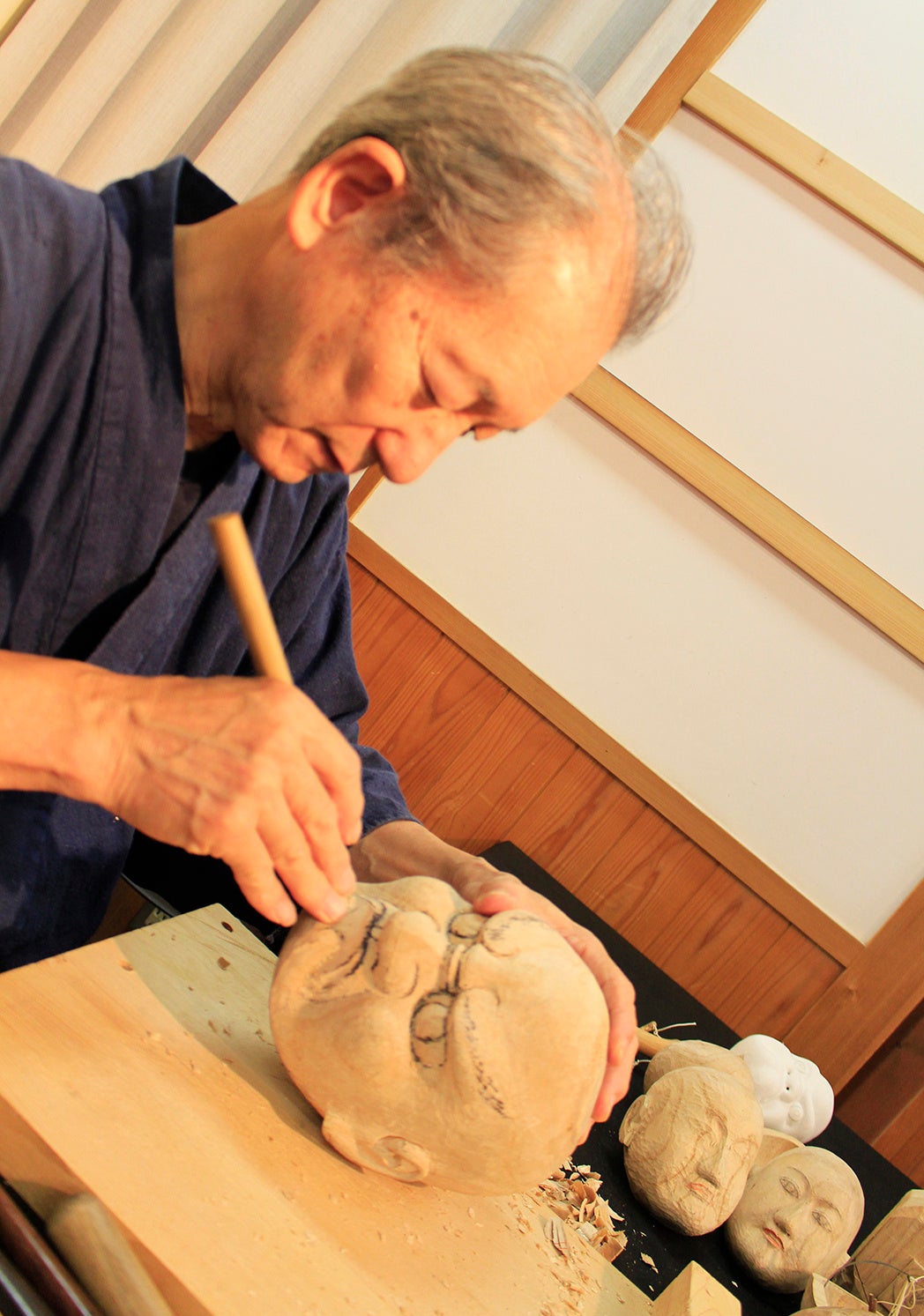 桐や檜の丸太から顔を彫りだし、耳の前で半分に割って中をくり抜いたところへ、役柄に応じたカラクリを仕込みます。目を閉じたり、口が開いたり、眉が上下に動いたり、クジラのひげを削ってつくるバネの力を利用した精巧な仕掛けです。塗りは、貝殻からつくる白色の顔料「胡粉(ごふん)」をニカワ(接着剤の一種)で溶いて約20回塗り重ねて磨きをかけます。面相筆(めんそうふで)という細い筆で眉や目を描き、髪を結って取り付けるまですべての作業を一人で行います。