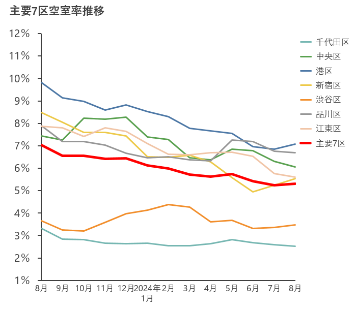主要7区の空室率について、中央区で回復、港区・新宿区で上昇、千代田区・渋谷区・品川区・江東区で横ばいとなった。港区では、三田エリアにおいて大型の空室消化があったものの、赤坂エリアにおいて大型物件が竣工したため、空室率が前月比で0.24pt上昇し、7.08%となった。