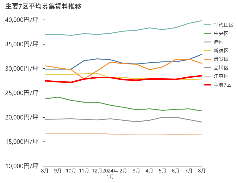 【2024年8月末時点の主要7区空室率・平均募集賃料の動向】
