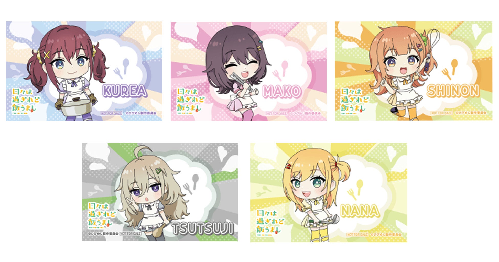 期間中TVアニメ「日々は過ぎれど飯うまし」の下記対象商品をご予約、ご購入1,100円(税込)毎に86mm×54mmサイズカード(全5種類)を1枚ランダムでプレゼント!