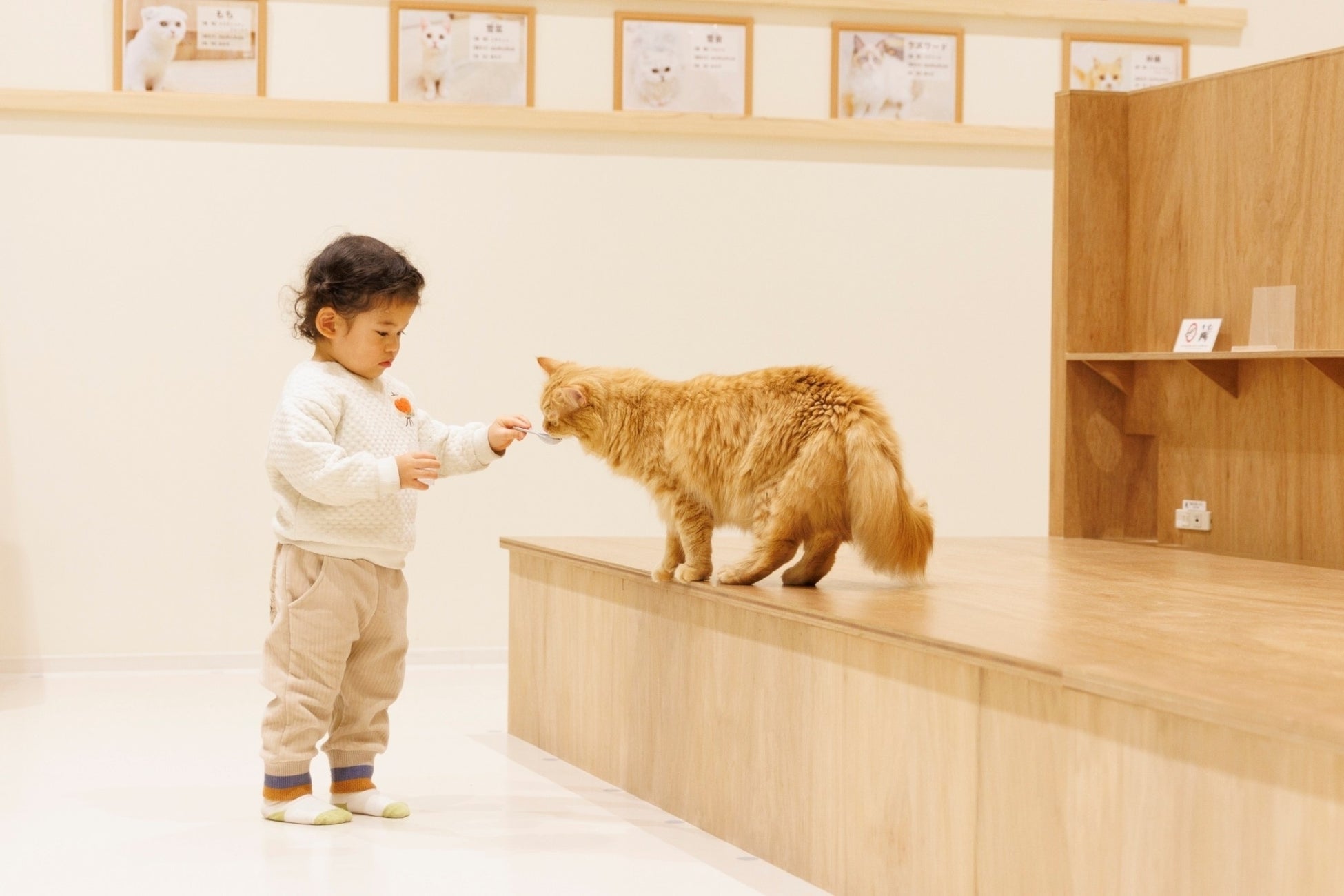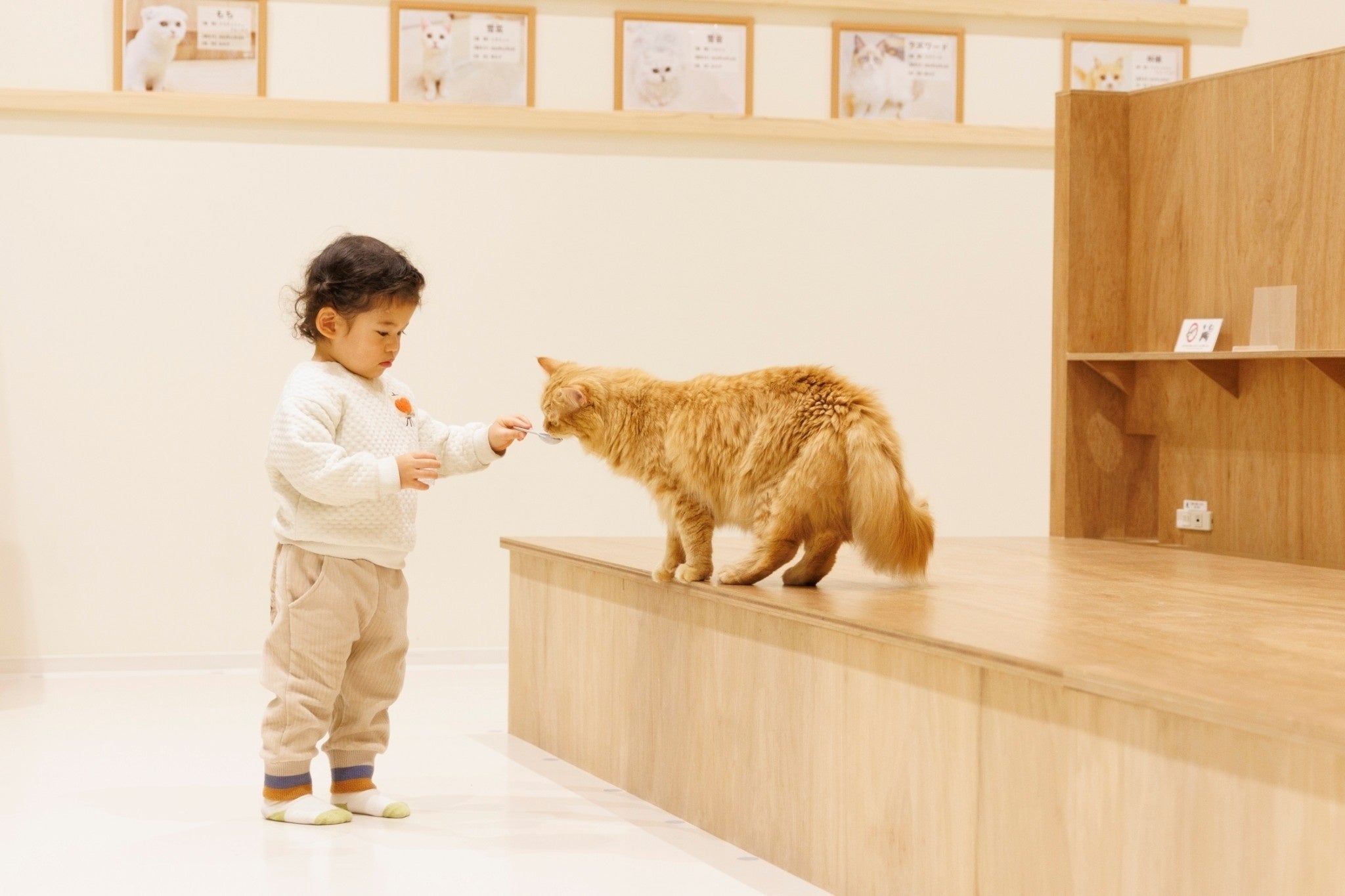 既存店では、“どうふつとのふれあいデビュー”としてご来園された小さなお客様が、最初は少し緊張して親御さまの後ろに隠れてしまう光景も少なくありません。しかし、スタッフのサポートのもとで猫たちが穏やかに過ごす様子を見ているうちに、次第に自分からそっと手を伸ばせるようになります。