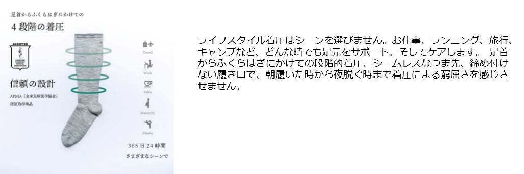 ソックウェルの商品は、全米足病医学協会(APMA)からの認証を受けています。本認証は、足病分野において世界的な権威を持つ医師の審査を通過することで与えられ、製品が足の健康維持、継続的な使用における足のケア・リカバリーに非常に高い効果があることが認められたことを示します。