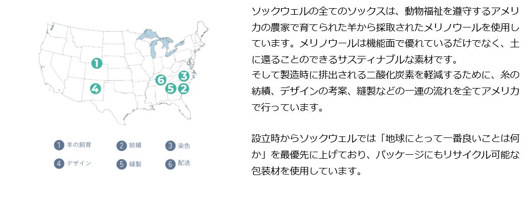 羊の種類は、3,000種類以上と言われています。生息地は、砂漠や山岳地帯など、世界中の様々な環境に適応した固有の種があります。ソックウェルは、北アメリカ大陸にあるロッキーマウンテンで、自由放牧されたランブイエメリノという品種から採取したウールを使用しています。ランブイエメリノは、数あるウールの中でも最高ランクに位置付けられており、弾力があり滑らかな肌触りが特徴です。なかでもソックウェルは19.5ミクロンと更に細い繊維を使用しており、一般的なウール製品に見られる「チクチクとした不快感」がほとんどありません。羊から採れるウールは100%天然素材。毎年、羊が新しい毛を作る過程で採れる豊かな自然の恵み。私たちにも地球にも優しいエシカルな素材です。