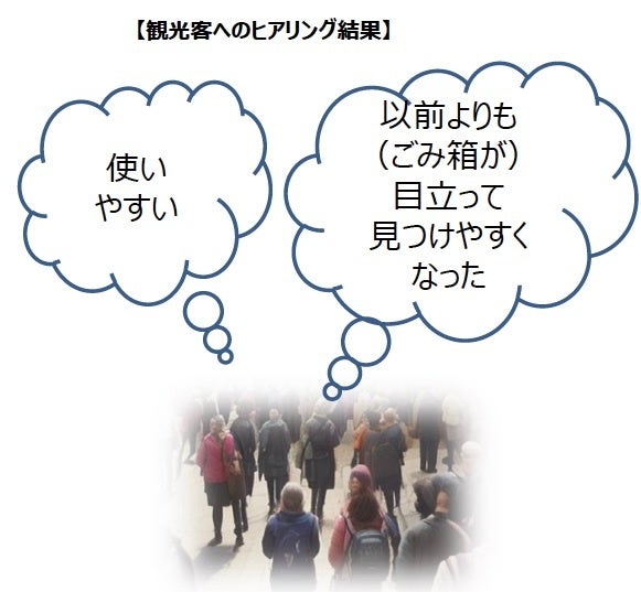 ごみのポイ捨て、散乱の減少とともに、「以前よりも(ごみ箱が)目立って見つけやすくなった」という観光客からの声や、企業からは「協賛しても良い」「費用や協賛メリットによっては協賛したい」という声も多く上がり、ごみ箱のメディア価値を向上させることができました。