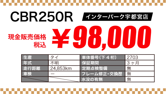 ・台数は全店で合計500台のご用意となります。 ※現金販売価格98,000円(税込) を含む ・最寄りのバイク王販売実施店舗へのご来店で、全国の初売り特選車の購入申し込みが可能です。 ・購入申し込みは先着順になりますので成約済みとなる場合がございます。 ・ただし、1月4日(日)・1月10日(土)に限り、例外として販売開始時(11:00)に同一車両に複数の購入申込みが発生した場合は、該当車両の販売方式を先着順から抽選へ切り替えさせていただきます。抽選結果につきましては、11:15までに店舗スタッフよりお知らせいたします。 ・車両のお取り置きや通販での購入申し込みはできません。 ・株主優待を除く他のキャンペーンや特典との併用はできません。 ・ご成約いただいた車両は最寄り店舗へのお取り寄せが可能です。配送料はスタッフへご確認ください。 ・車両購入の際にはバイク王会員登録(無料)をお願いいたします。 |