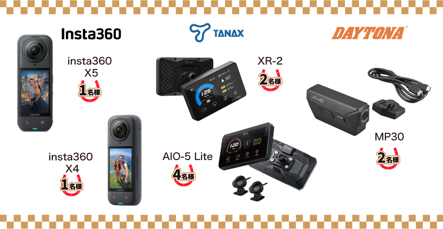 ・[TANAX] スマートライドモニター AIO-5 Lite (2本) ・[TANAX] スマートライドモニター XR-2(4本) ・[ARCHISITE] アクションカメラ insta360 X4(1本) ・[ARCHISITE] アクションカメラ insta360 X5(1本) ・[デイトナ] ヘルメット取付型ドライブレコーダー MP30 GPS(2本) |