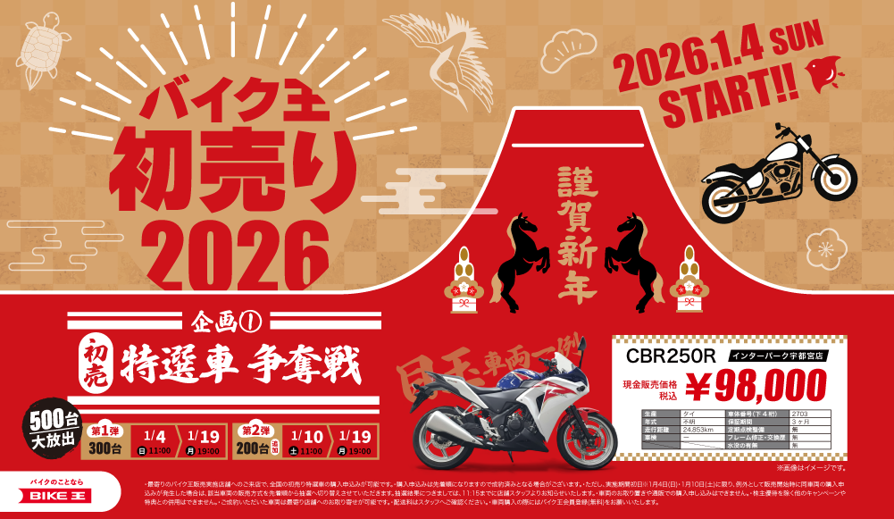 「バイク王の初売り2026」は、年間取扱台数約10万台のバイク王の豊富な在庫の中から、現金販売価格98,000円(税込)の目玉車両をはじめとした特選車を期間合計で500台ご用意。初売りの第一弾は2026年1月4日(日)11時から300台、第二弾は1月10日(土)11時から200台を追加、合計で500台を販売予定です。今年の初売りは最後までお楽しみいただけるキャンペーンとなっておりますので、ご都合に合わせてお近くのバイク王店舗までぜひお越しください。