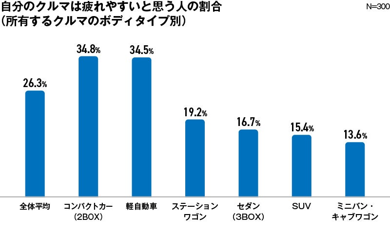 さらに、ボディタイプ別に「自分のクルマは疲れやすいと思うか」を尋ねたところ、コンパクトカーや軽自動車など小型車に乗っている人の方がより「自分のクルマは疲れやすい」と思っていることがわかりました。反対に、ミニバンやSUVなど大型車に乗っている人は少ない結果となっています。長距離でも疲れにくい軽自動車やコンパクトカーもあるものの、傾向としては「大型のクルマは疲れにくい」と言えそうです。