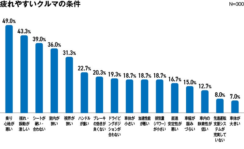 その結果、疲れやすいクルマの条件トップ3は「乗り心地が悪い」「揺れ・振動が激しい」「シートが合わない」という“座り心地”に関連するものが占めました。