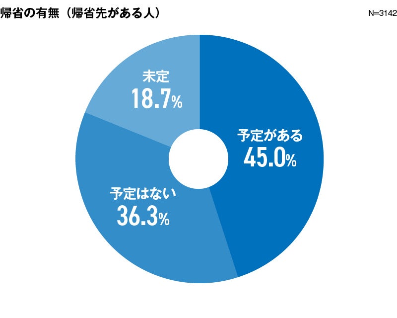 年の瀬が近づき、年末年始のカレンダーを眺めながら仕事納めのタイミングや帰省先での過ごし方を考えている方も多いのではないでしょうか。今回実施した調査ではまず、帰省先がある人に年末年始の帰省予定を聞きました。すると、帰省予定のある人は45%と半数近く。未定と答えた人も含めると、7割程度が帰省をするか、検討中であるといえます。
