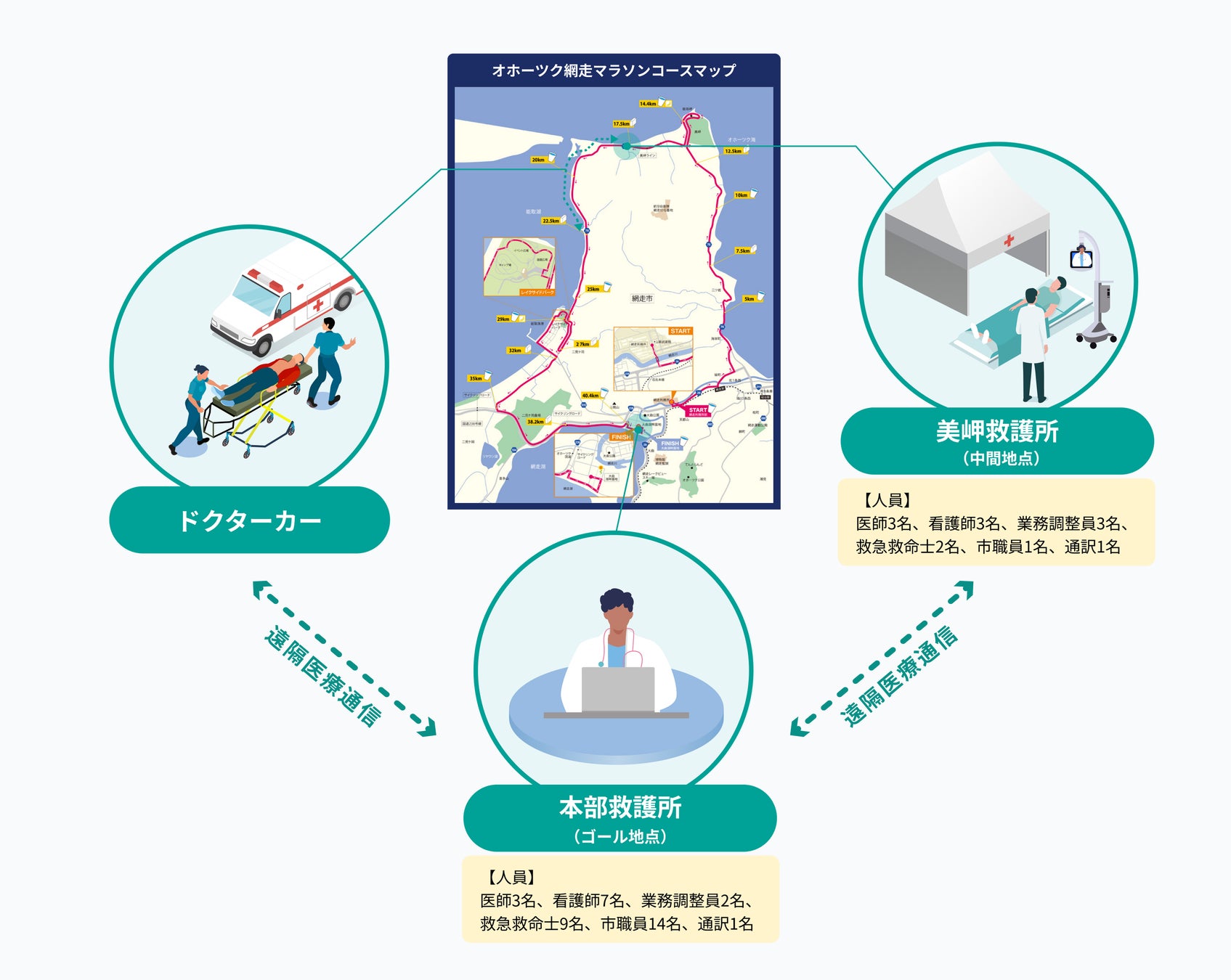 「オホーツク網走マラソン2024」では、過去の大会において、心臓発作を発症したランナーがいたことから、本大会の医療救護班の一役を担う日本赤十字社北見赤十字病院(所在:北海道北見市、院長:荒川穣二、以下「北見赤十字病院」)の実証実験の一環として、遠隔での医療体制の構築に「Teladoc HEALTH」が導入される運びとなりました。