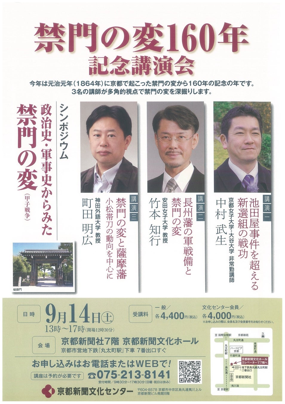 京都新聞グループの京都新聞企画事業株式会社では、1864(元治元)年に京都で起こった「禁門の変」(蛤御門の変)から160年の節目となる今年、3人の研究者を招いた講演会・シンポジウムを企画しました。新選組研究の中村武生さん、軍事史研究で著名な竹本知行さん、薩摩藩など多方面で研究実績のある町田明広さんに、政治史・軍事史の多角的視点から深堀りしていただきます。新たな発見や今まで注目されなかった問題点・争点の発掘に期待ができるプレミアムな講演会・シンポジウムです。