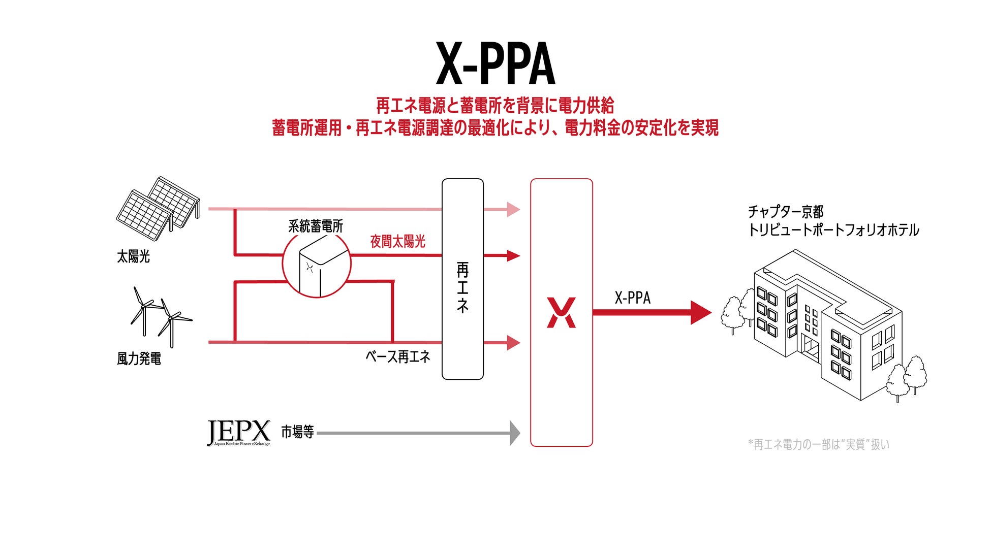 株式会社パワーエックス(東京都港区、取締役 代表執行役社長CEO 伊藤 正裕、以下「パワーエックス」)は、世界最大級のオルタナティブ投資運用会社であるブラックストーンが運用するファンドのポートフォリオ・カンパニーであるJapanCor株式会社(東京都千代田区、CEO 貝塚 浩康)がアセットマネジメントを行う「チャプター京都トリビュートポートフォリオホテル」(京都府京都市中京区)に、2024年9月より蓄電池を活用した再生可能エネルギー電力の供給を開始します。本件は、当社の電力供給サービス「X-PPA」が関西エリアの物件で初めて導入される事例となります。