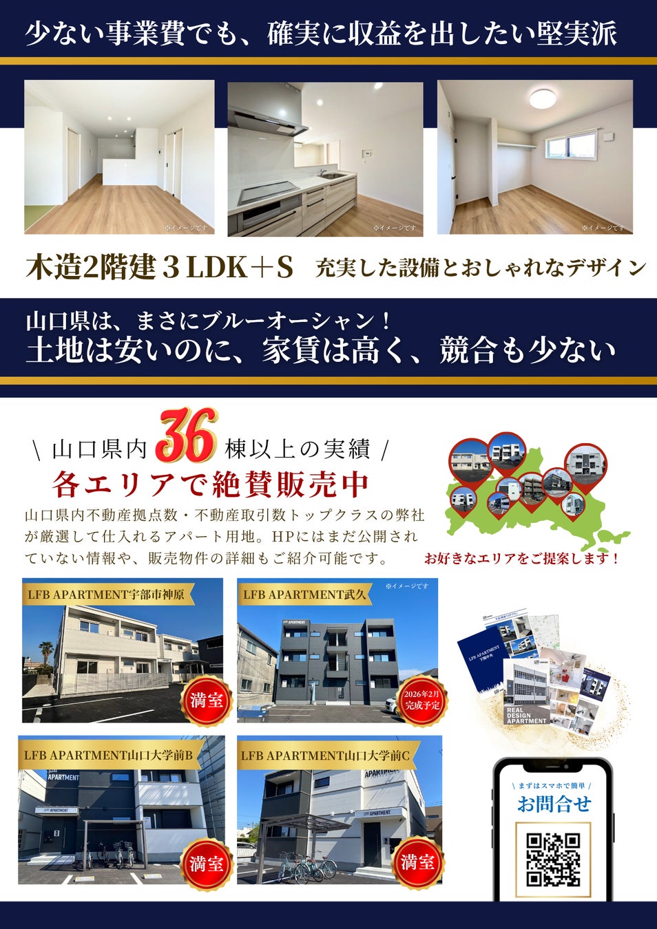 弊社がお届けする投資用新築アパート LFB APARTMENT。住む人の美意識を触発するデザイン、高い防音を実現した間取りだけでなく、利便性の良い立地にもこだわっており、賃貸物件数が少ない山口県では高い入居率を実現しています。