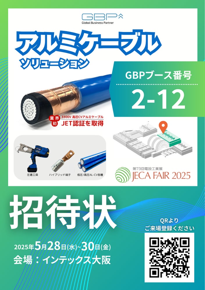 再生可能エネルギー、EV自動車部品、AI及びIoT領域における先進技術を駆使し、グローバルに急速に成長している、~再エネ業界の風雲児~ GBP株式会社(本社:東京、以下GBP)は、2025年5月28日(水)より3日間、大阪インテックスにて開催される「JECA FAIR2025~第73回電設工業展」に出展します。アルミケーブルソリューション、トランス、銅ケーブルなどを展示します。