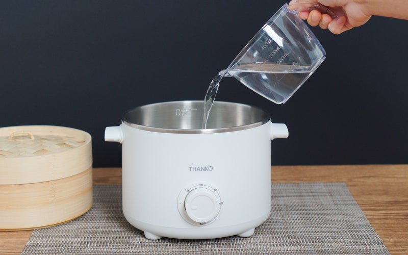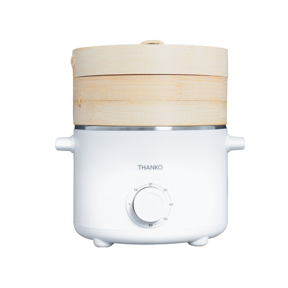本体サイズ幅24.5×奥行21×高さ15cm、せいろ直径18cm。使い方は本体に水を入れ、せいろにお好きな食材をのせ本体にセット、電源ダイヤルを回せばOK。最大60分までの調理時間設定、最大水容量1.4L。肉まんやシュウマイなどの天心や温野菜なら約10-15分、お肉類なら10-30分で調理できます。また本体に直接食材を入れて電気鍋としてもお使いいただけます。
