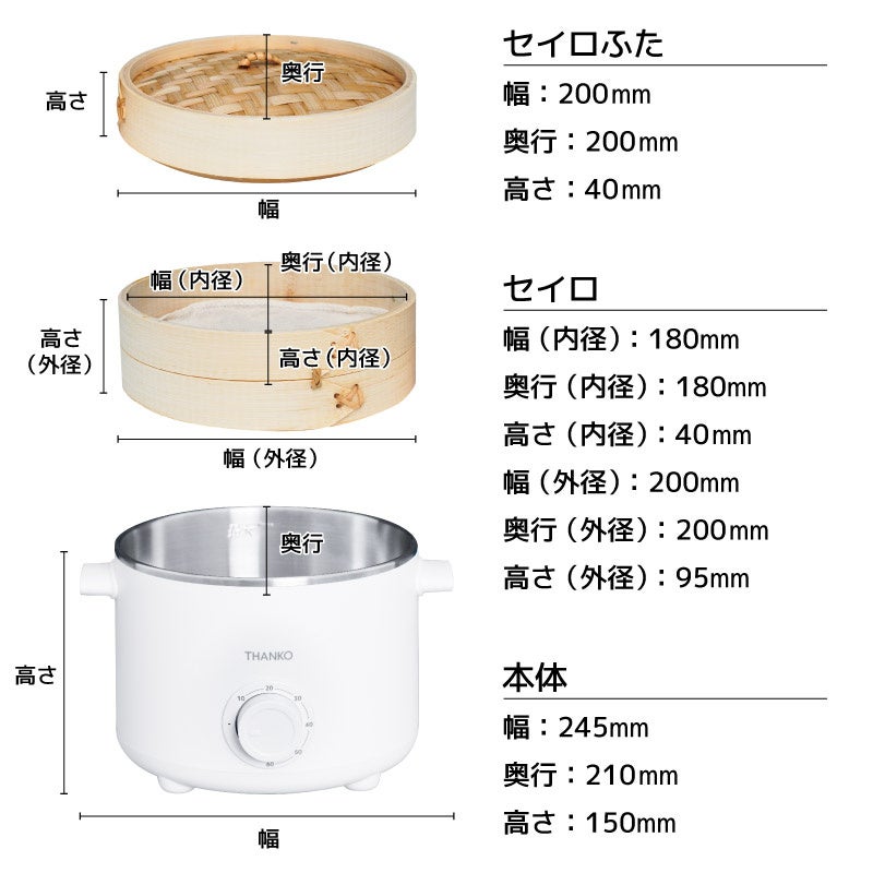 ・サイズ/本体:幅245×奥行210×高さ150(mm)/セイロ外径:幅200×奥行200×高さ95(mm)