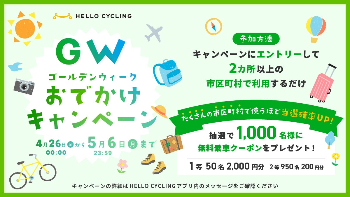 OpenStreet株式会社(本社:東京都港区、代表取締役社長CEO:工藤 智彰、以下「OpenStreet」)は、キャンペーン期間中に2つ以上の市区町村で「HELLO CYCLING」をご利用いただいた方の中から抽選で1,000名さまに、最大2,000円分のクーポンをプレゼントする「ゴールデンウィークおでかけキャンペーン」(以下、本キャンペーン)を、2024年4月26日から5月6日まで実施することをお知らせします。