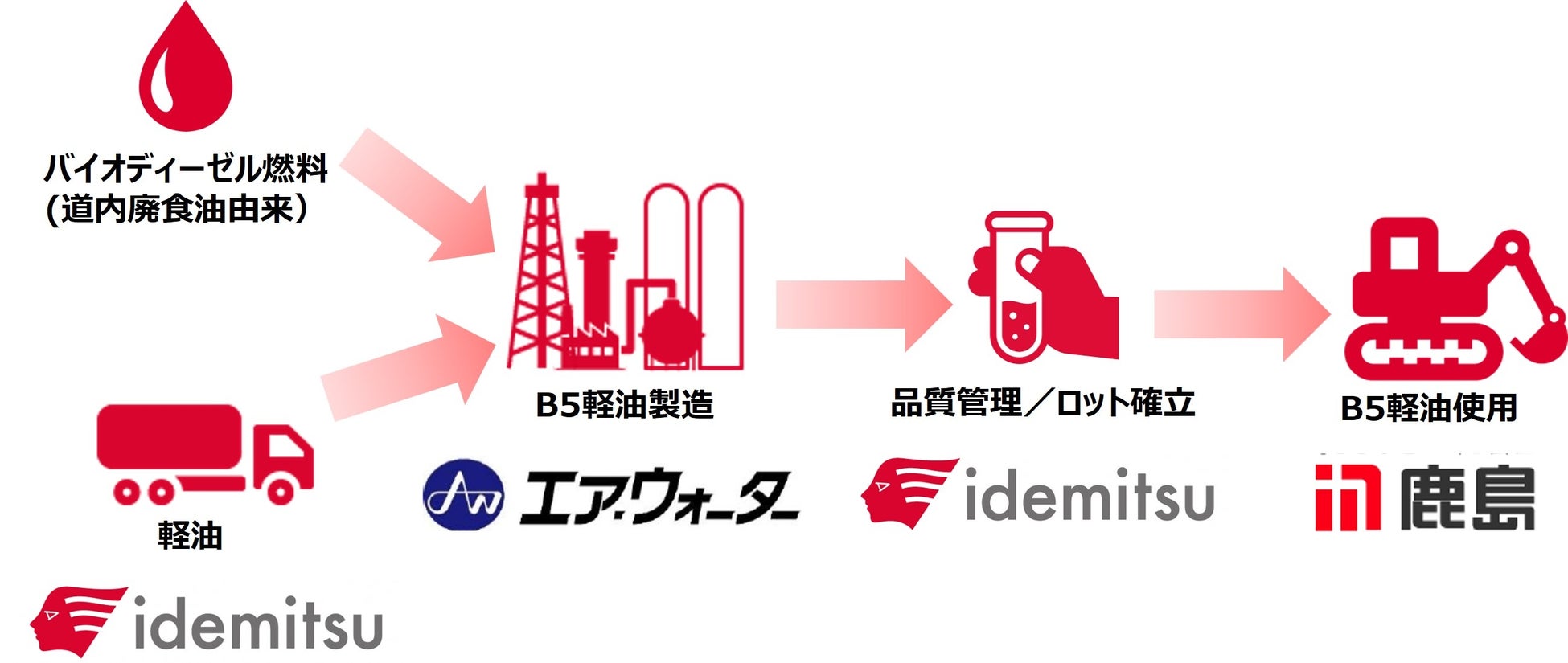 出光興産株式会社(本社:東京都千代田区、代表取締役社長:木藤 俊一、以下「出光」)、エア・ウォーター株式会社(本社:大阪府大阪市中央区、代表取締役会長・CEO:豊田 喜久夫、以下「エア・ウォーター」)、鹿島建設株式会社(本社:東京都港区、代表取締役:天野 裕正、以下「鹿島」)は、鹿島が北海道内の工事現場で使用する建設機械および発電機向け燃料として、バイオディーゼル燃料*¹を混合した軽油(以下「B5軽油」*²)の供給・使用を開始します。