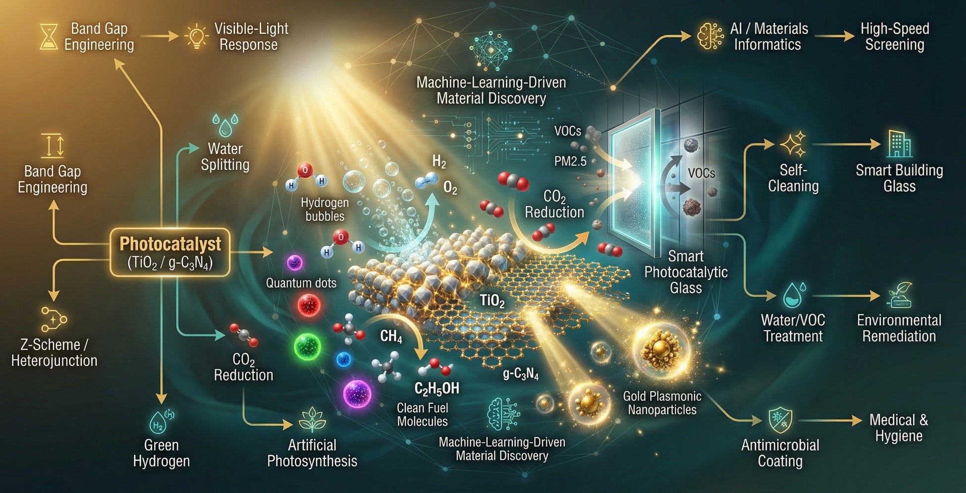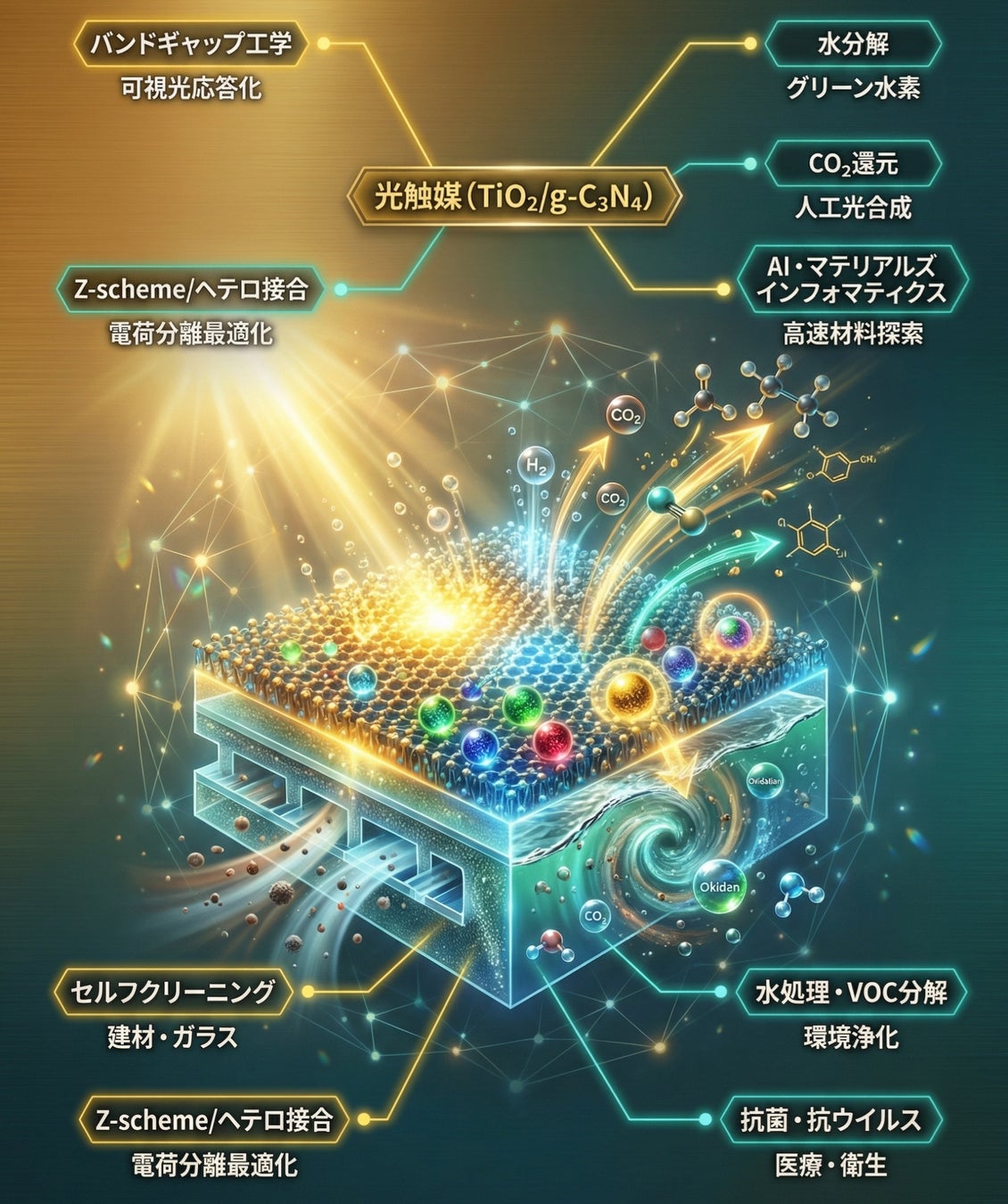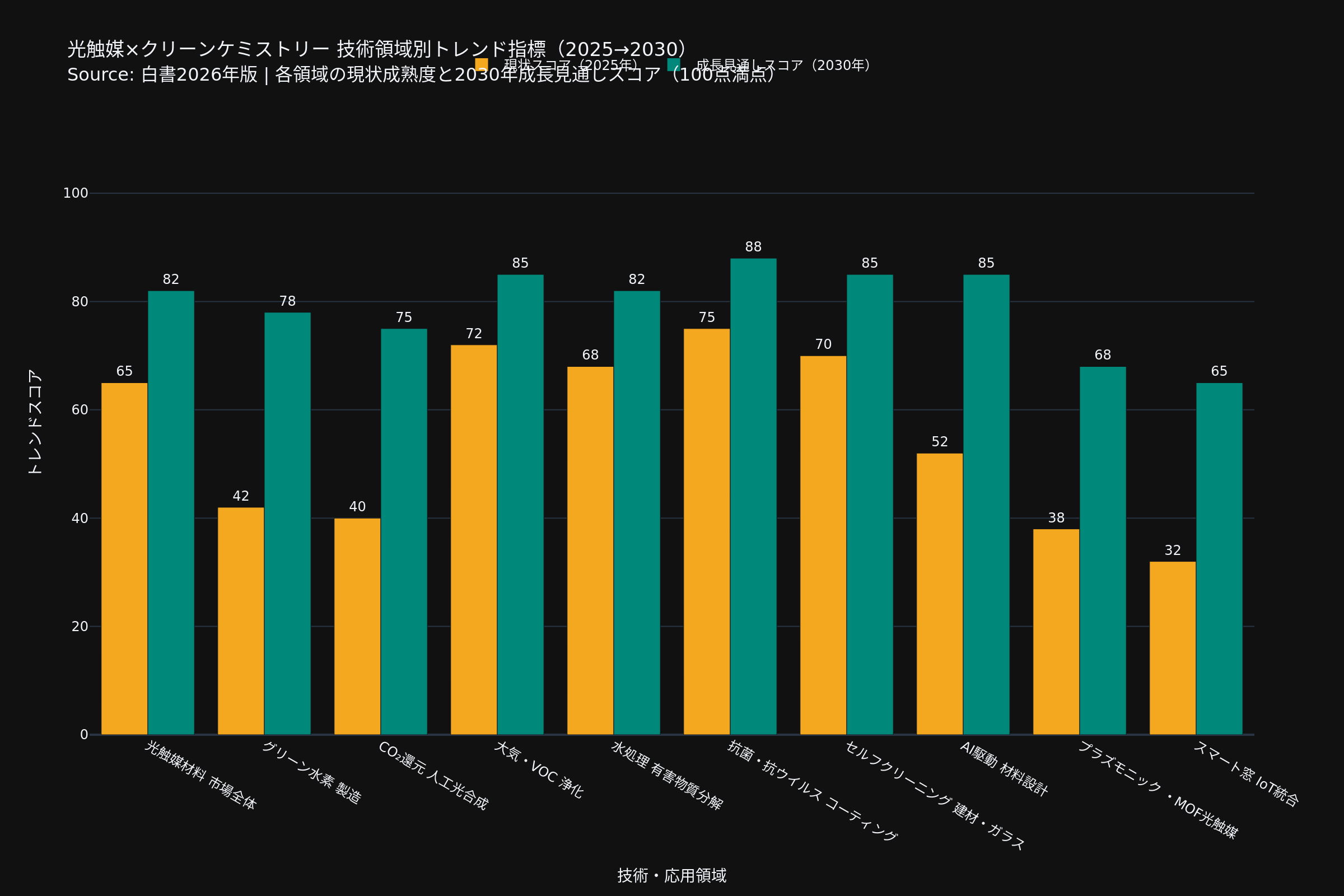 太陽光駆動CO₂還元・共電解による高付加価値化学品(C2+)量産・IoT連携型自律スマートウィンドウ(光発電×光触媒×AI)など、次世代の社会インフラ構成要素として光触媒システムを設計・実装する段階に移行する。レアメタルフリー・リサイクル可能触媒・LCAを組み込んだサステナブルプロセス設計が、2035年以降の製品競争力の根幹となる。