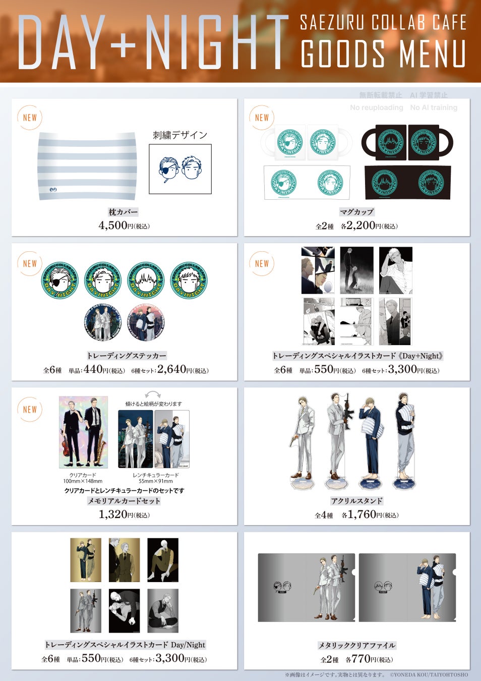 コラボカフェでは作品をイメージしたフードや登場人物の誕生日酒をノンアルコールドリンクにして提供、今回あらたなカフェメニューやグッズも登場します!! セリフが刻印された2連リングはリバイバルカフェにて初披露&先行販売となります。リバイバルカフェ「DAY+NIGHT」ご予約絶賛受付中!!