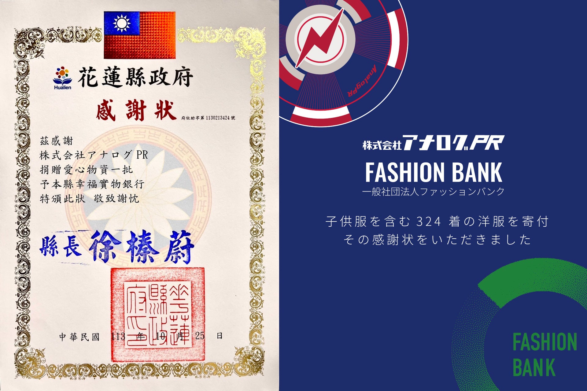 「企業の情報と印象をデザインする」をコンセプトに掲げ、メディアとWEBとオフラインを融合させたマーケティング戦略を提供する、株式会社アナログPR(本社:東京都港区、代表取締役:松浦啓介)は2024年4月3日に発生した花蓮地震に対し、一般社団法人FASHION BANKとともに行った寄付への感謝状を2024年10月25日(金)に頂戴したことをお知らせいたします。