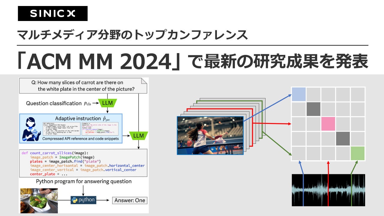 「ACM MM」は、マルチメディア分野における国際的に権威のあるトップカンファレンスの一つです。2024年は4,385件の投稿の中から、約26%にあたる1,149件の論文が採択され、10月28日から11月1日にかけてオーストラリア・メルボルンで開催されます。OSXからは「説明性のある視覚的質問応答システム」について発表します。また、同国際会議内の講演イベント Industry Expert Talks※ および、併催されるワークショップ ACM MMSports‘24※ においても、それぞれ発表します。