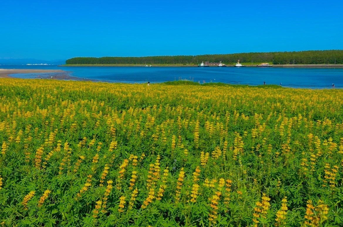 柏原海岸には南北約1キロにもおよぶルーピン畑があり、3月下旬~4月中旬になると約100万本のルーピンが咲き乱れ、美しい黄色に染め上げます。
