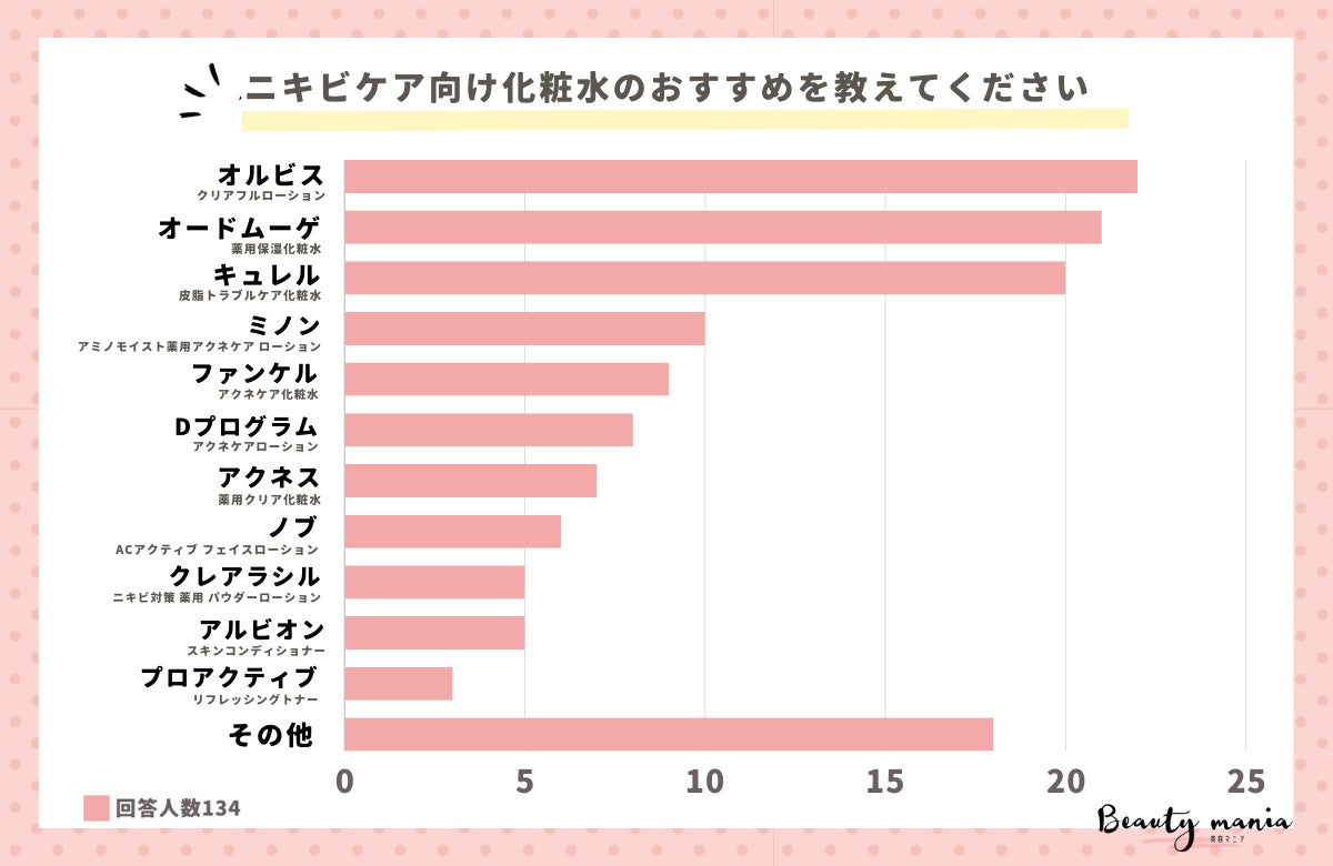 「ニキビケア向け化粧水のおすすめを教えてください」というテーマで134人にアンケートを行ったところ、「オルビス:クリアフルローション」と回答したのは全体の16.4%でした。